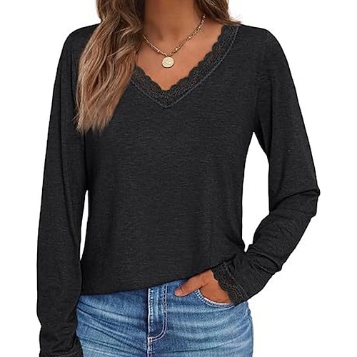 Per donna Blusa Top Eleganti Top in pizzo Tinta unica Semplice Elegante Vintage Signore Manica Lunga Scollo a V Top Regolari Lavoro Quotidiano Ferie Bordo in pizzo Drappeggiato Nero Bianco Vino