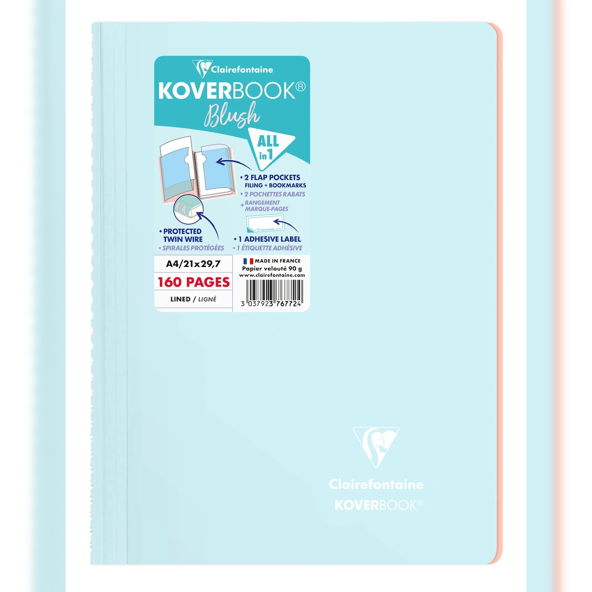 Clairefontaine 5x Koverbook Spiralblock A4, 80 Blatt liniert mit Rand, Einband aus PP - Eisblau/Koralle 376772C