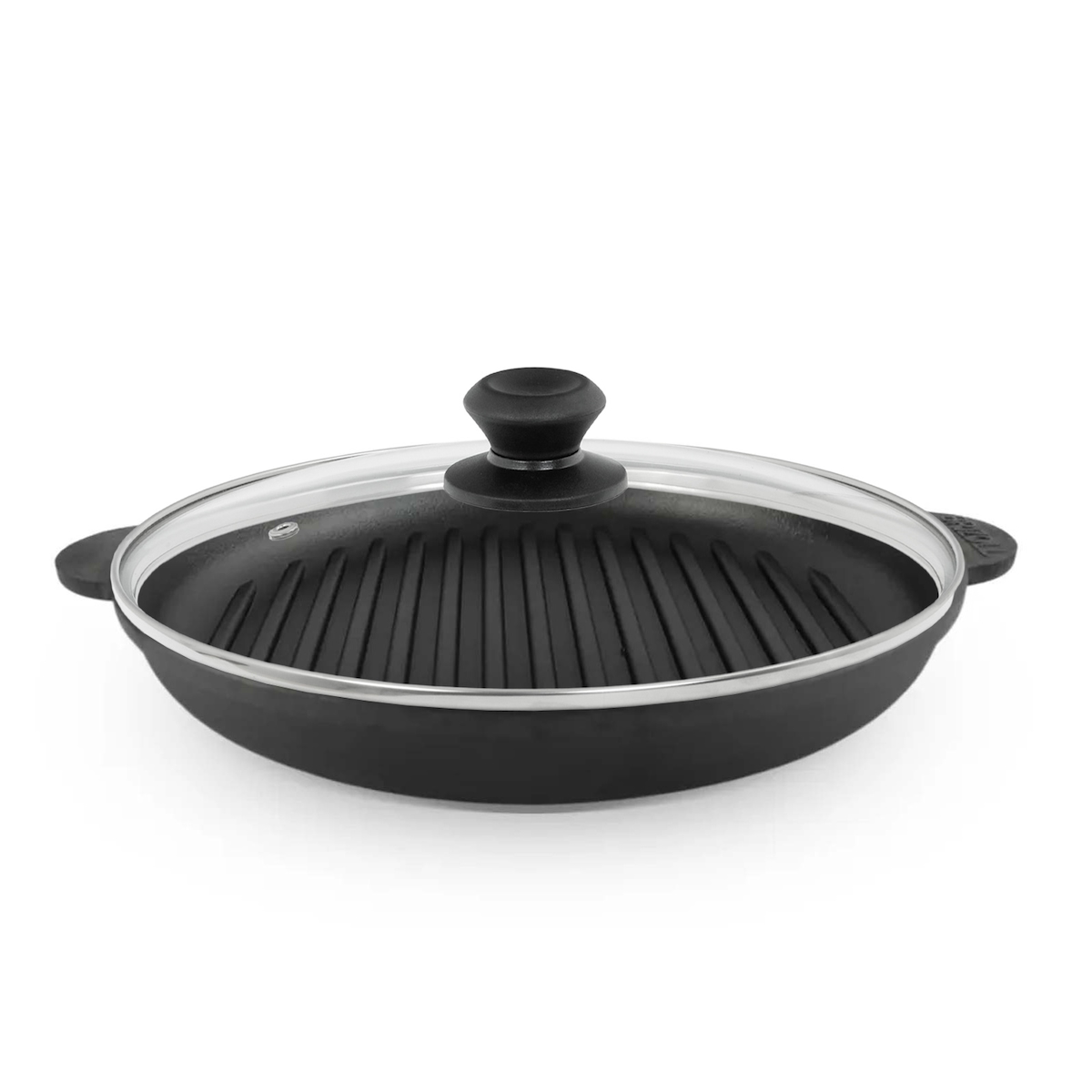 BRIZOLL Ø26cm Grillpfanne aus Gusseisen Bräter mit Glasdeckel Schmortopf zwei Griffe Servierpfanne Grill