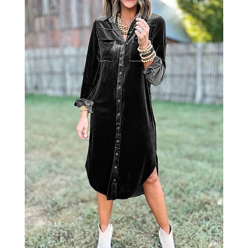 Per donna Abito Midi Abito in Velluto Abito Camicia Moderno All'aperto Vacanza Uscire Vestibilità regolare Semplice Manica Lunga Colletto a Camicia Nero Vino Verde militare Primavera Autunno