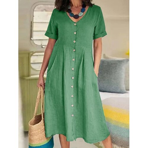 Per donna Abito Midi Abiti ispirati al lino Abito Camicia Vestito Casual Abito in cotone e lino Casual Quotidiano Vestibilità comoda Semplice Manica Corta Colletto a Camicia Verde militare Nero Rosso