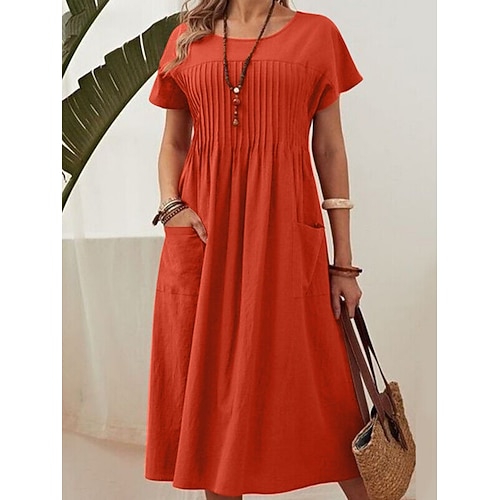 Vestito midi in cotone e lino da donna, estivo, casual, quotidiano, per le feste, vestibilità regolare, tinta unita, manica corta, con revers, rosa, blu, arancione, verde, estate, primavera.