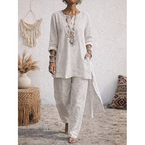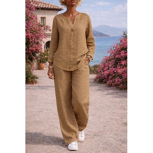 Set di camicie boho da donna, due pezzi in simil lino, pantaloni a gamba larga in lino e cotone sintetico, maniche lunghe, scollo a V, tinta unita, moda streetwear, casual, quotidiano, blu, nero, bianco, estivo, vestibilità regolare.