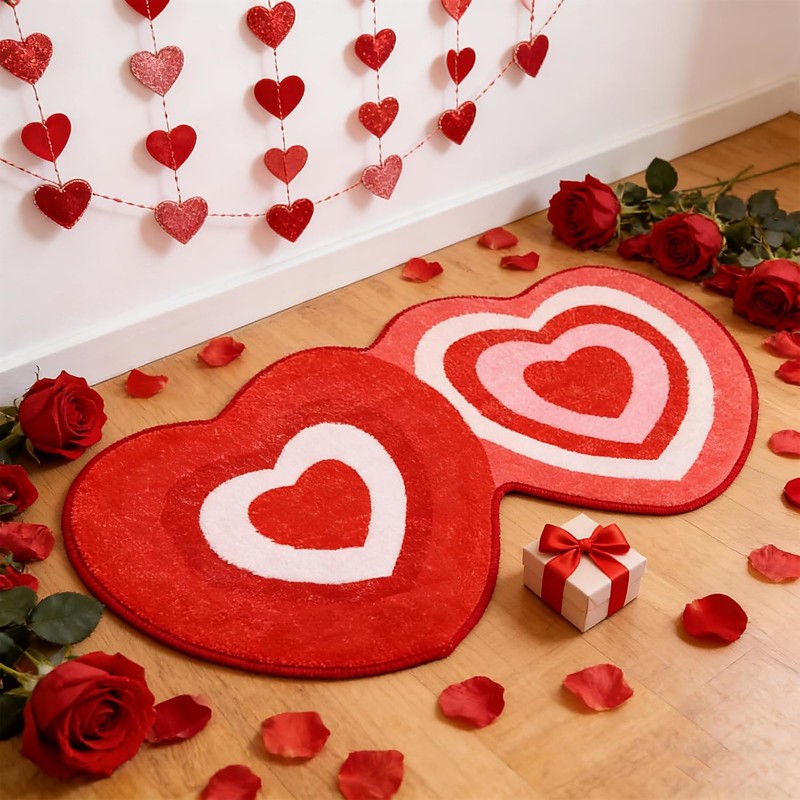 Valentine's Doormat Heart Shaped Bathroom Rug, Red Pink White Love Shower Mat, Non-Slip Rugs for Bedroom, Kitchen Decor