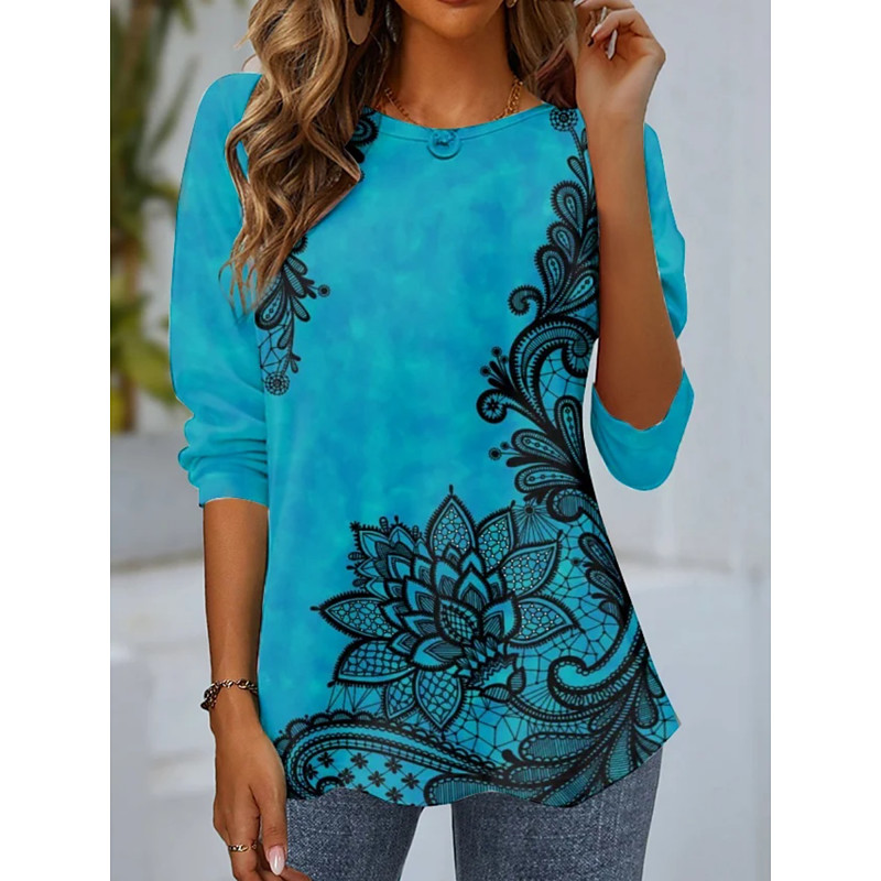 Women's T Shirt Floral Graphic Fashion Classic Casual Long Sleeve Crew Neck Regular Tops Daily Weekend Vacation Wear Print Blue Summer Spring Fall
