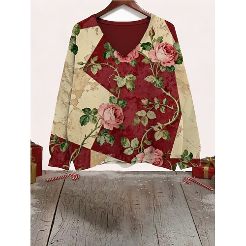 Per donna Felpa Maglione Vintage Moda Streetwear Floreale A Coste Scollo a V Oversize Lavorato a maglia Stampato Manica Lunga Top Regolari Maglia All'aperto Quotidiano Vino Primavera Autunno