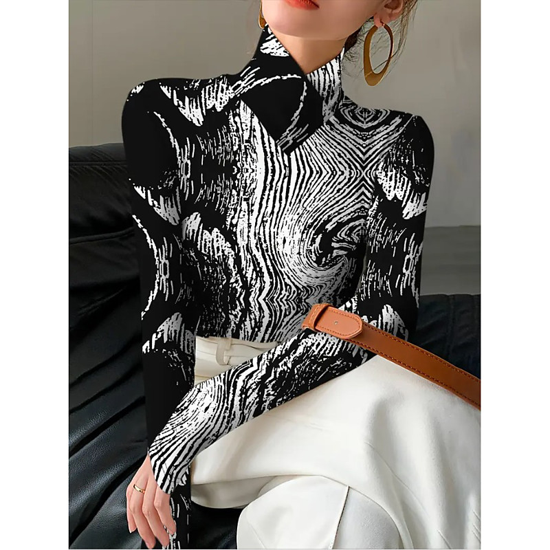 Women's T Shirt Graphic Abstract Elegant Vintage Stylish Long Sleeve High Neck Asymmetric Neck Regular Tops Daily Print Tiered Black and White Pink Brown Spring Fall Winter