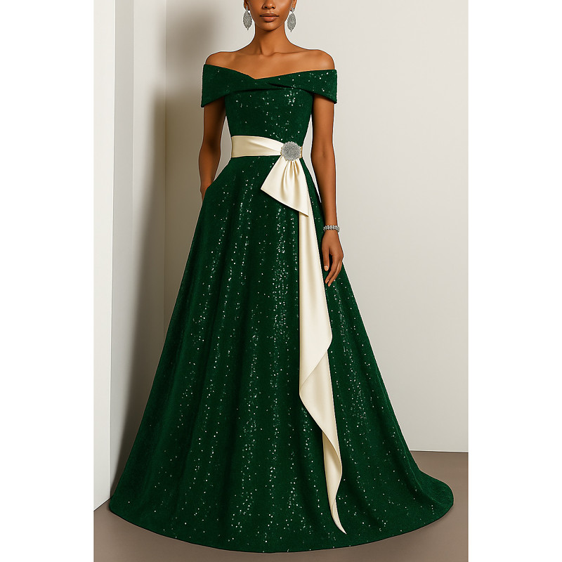 A-Line Floor Length Prom Dresses Evening Gown Ball Gown Formal Dress Elegant Glittering Short Sleeve Off Shoulder Wedding Formal Sequined with Glitter Pleats