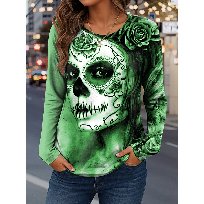 Women's T Shirt Skulls Graphic Fashion Casual Long Sleeve Crew Neck Regular Tops Daily Weekend Print Red Blue Purple Green Khaki Spring Fall Winter