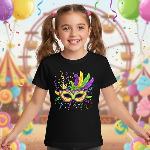 100% Baumwolle Mardi Gras 2026 Karneval Kinder Mädchen Blau Schwarz Weiß Grafik Maske T-Shirt Rundhalsausschnitt Kurzarm Urlaub Sport Outdoor Alltagskleidung Aktiv Urlaub Lässig Drucken Sommer