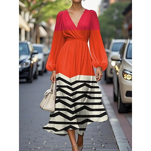Per donna Abito Midi Abito a trapezio Vacanza Casual Quotidiano Festa serale Feste Vestibilità regolare Grafico Geometrico Manica Lunga Scollo a V Rosa scuro Rosso Marrone Verde Estate Primavera