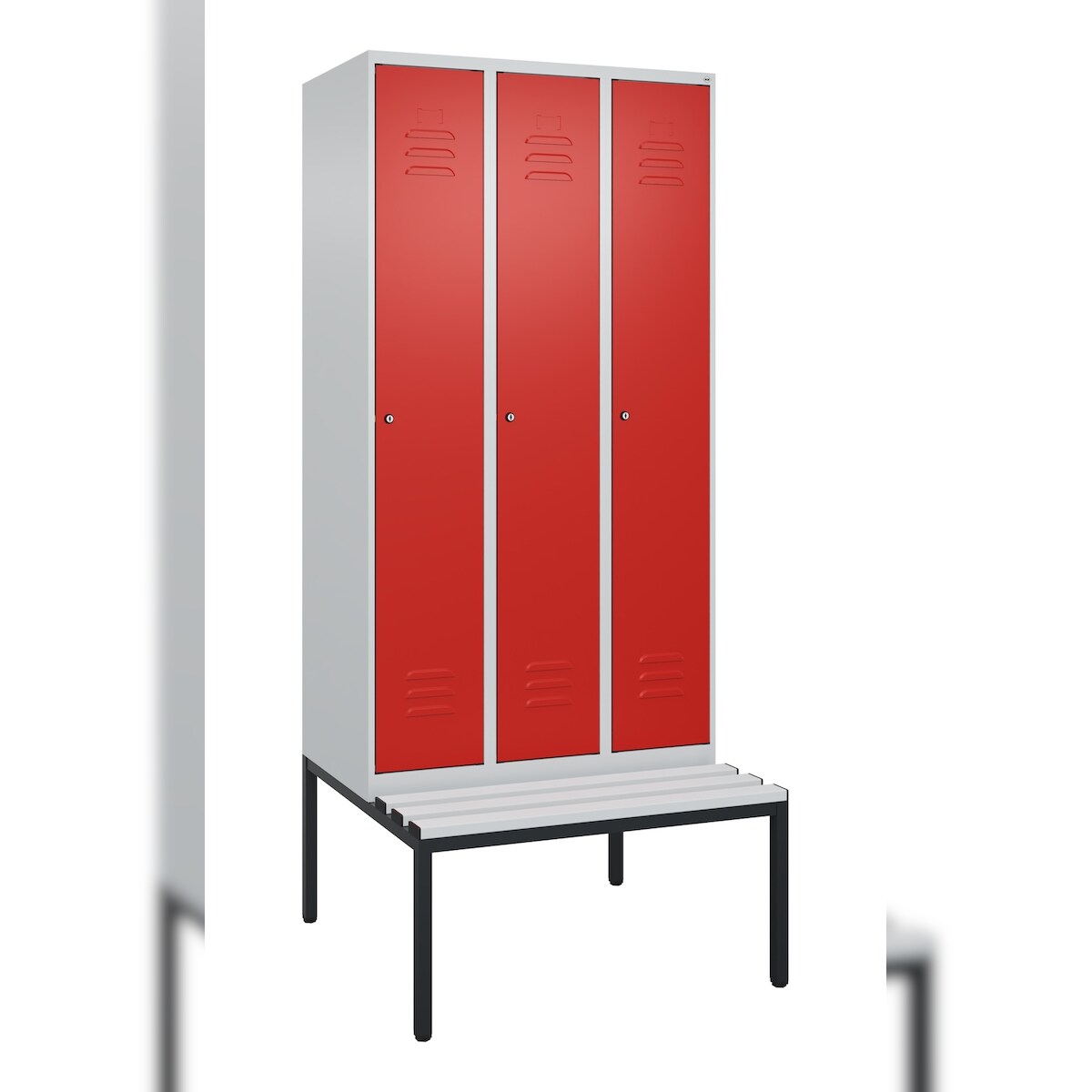 C+P Spind Classic PLUS, Kunststoff untergebaute Sitzbank, 3 Abteile, HxBxT 212x90x82cm, Zylinderschloss, Hellgrau/Rot von PROREGAL
