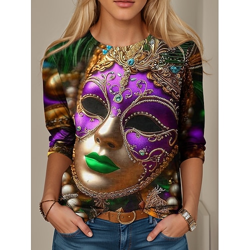 Maglietta da donna Carnival con grafica geometrica vintage alla moda a maniche lunghe collo tondo ampio stampa gialla viola primavera inverno