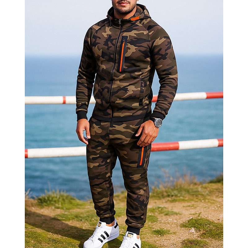 Men's Hoodie Tracksuit Hoodie Pants Outfit Set Hoodies Set Hoodie Outdoor Daily Sports Jacquard Drawstring Pocket Plain Black Orange Khaki Polyester Activewear Fashion Streetwear Spring