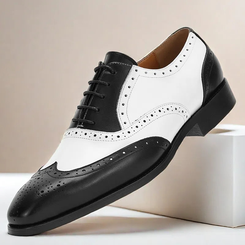 Men's Black and White Wingtip Oxford Shoes – Premium Cowhide Leather, Brogue Detailing, Classic Formal Style, Perfect for Weddings and Business Attire
