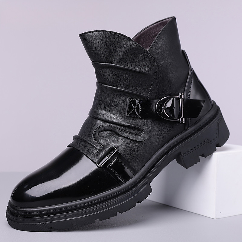 Men's Black Patent Leather Chelsea Boots – Crocodile Pattern with Double Buckle Straps and Rugged Sole, Perfect for Formal and Casual Wear
