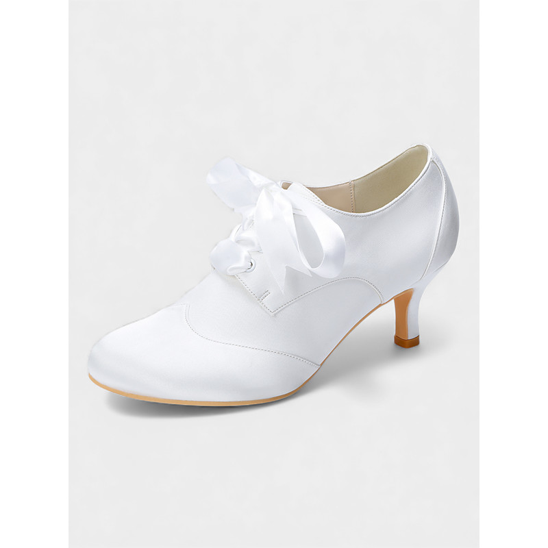White Satin Kitten Heel Wedding Shoes for Women with Floral Embroidery and Cross-Strap Design - Perfect for Brides and Formal Occasions