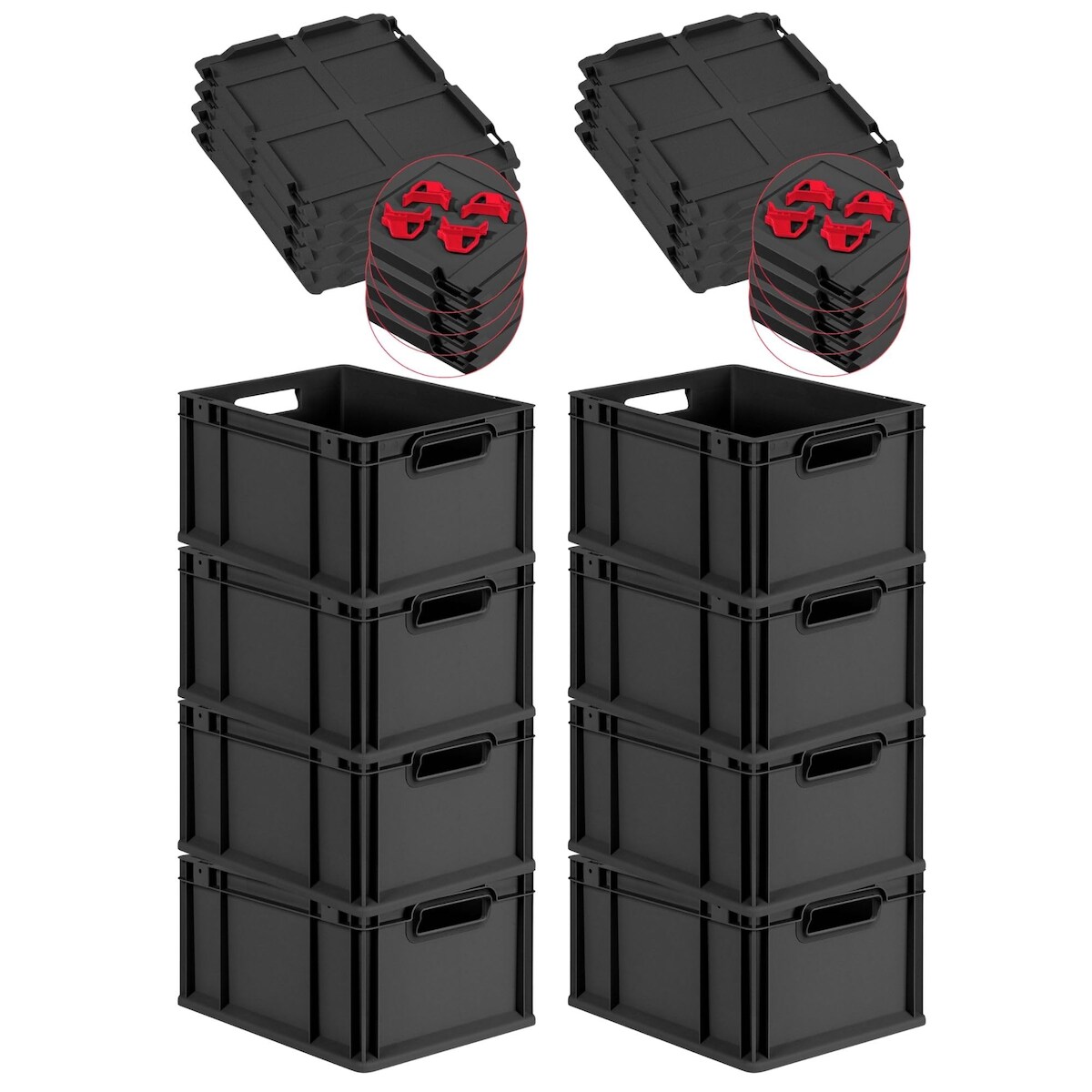 PROREGAL SuperSparSet 8x Eurobox NextGen Grip mit Scharnierdeckel & roten Verschlüssen, HxBxT 22x30x40cm, 20L, Schwarz, Griffe offen, Eurobehälter