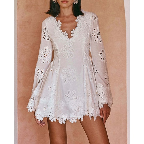 Per donna Mini Abito Abito in Pizzo Vestito Estivo Elegante Moderno All'aperto Spiaggia Vacanza Vestibilità regolare Semplice Manica Lunga Scollo a V Bianco Estate Primavera