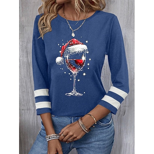 Camicia Blusa Donna Natale Bicchiere di Vino Casual Manica Lunga Collo Crew Regular Tops Quotidiana Patchwork Nera Vino Blu Verde Autunno Inverno