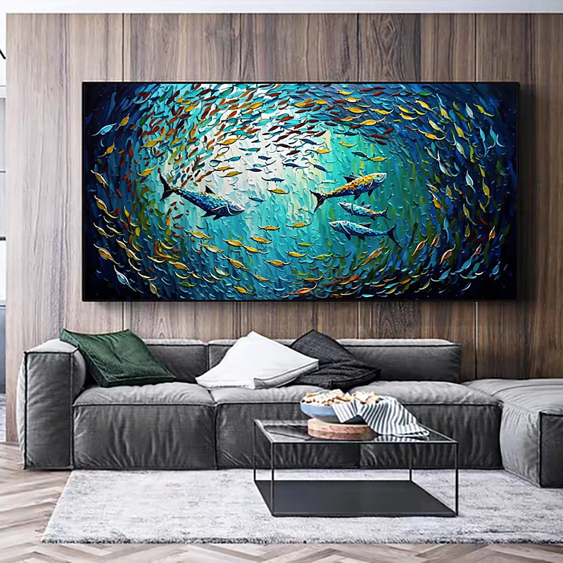 Mintura Handmade Abstract Fish School Oil Paintings On Canvas Wall Art Decoration Modern Picture For Home Decor Rolled Frameless Unstretched Painting