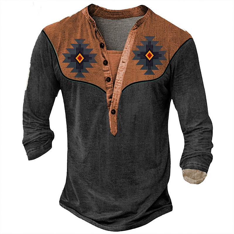 Men's Aztec Cowboy T Shirt Henley Shirt Long Sleeve 3D Print Designer Retro Vintage Western Style Street Casual Daily Summer Spring Fall Black Brown Green Gray Henley Henley T-Shirt