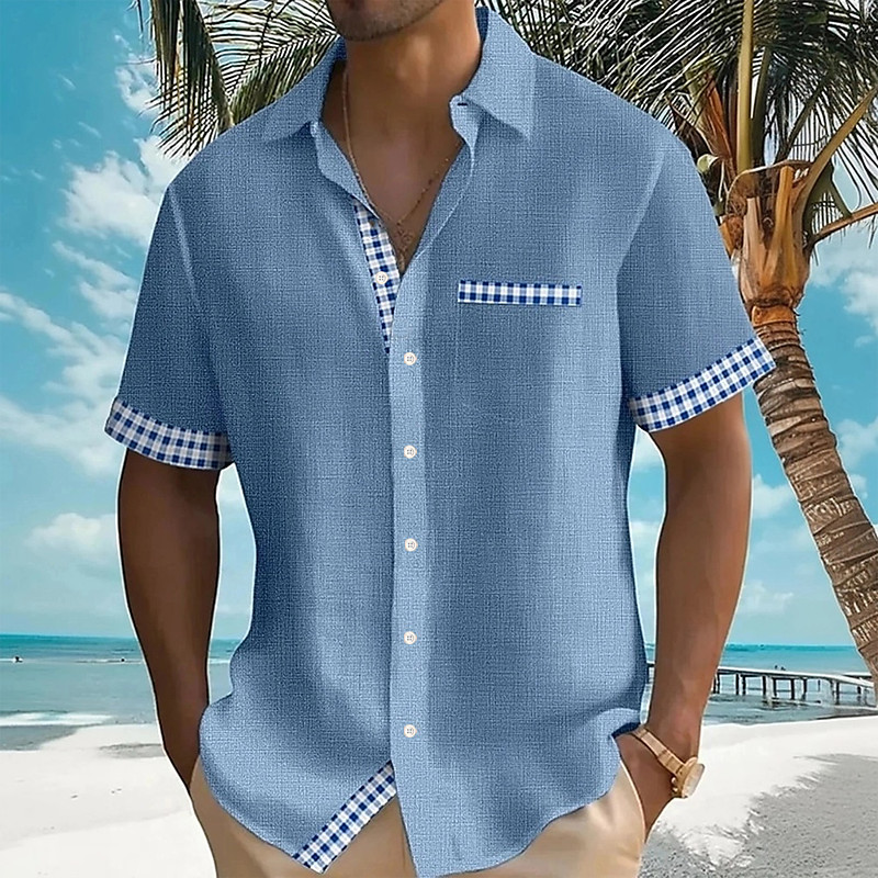 Men's Geometric Grid / Plaid Shirt Summer Shirt Button Up Shirt Short Sleeve Fashion Casual Vacation Holiday Streetwear Summer Turndown 3D Print Front One Pocket Linen Like Shirt Yellow Blue Green