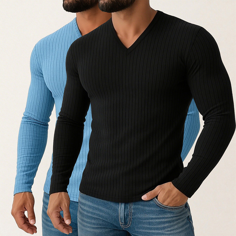 2 Piece Men's T Shirt Ribbed Knit tee Tee Top Long Sleeve Shirt Long Sleeve V Neck Spring Fall Winter Plain Pit Strip Fashion Designer Basic Knitting Vacation Street Casual Black Purple Tee