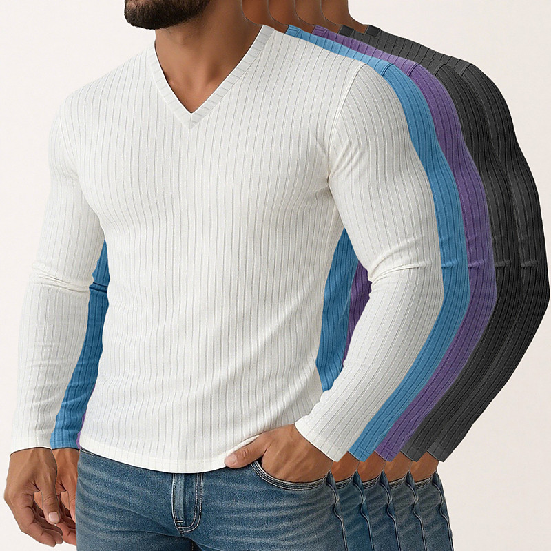 Men's T Shirt Ribbed Knit tee Tee Top Long Sleeve Shirt Long Sleeve V Neck Spring Fall Winter Plain Vertical Stripes Pit Strip Fashion Designer Basic 5-Piece Multi-pack Vacation Street Casual 8# 9