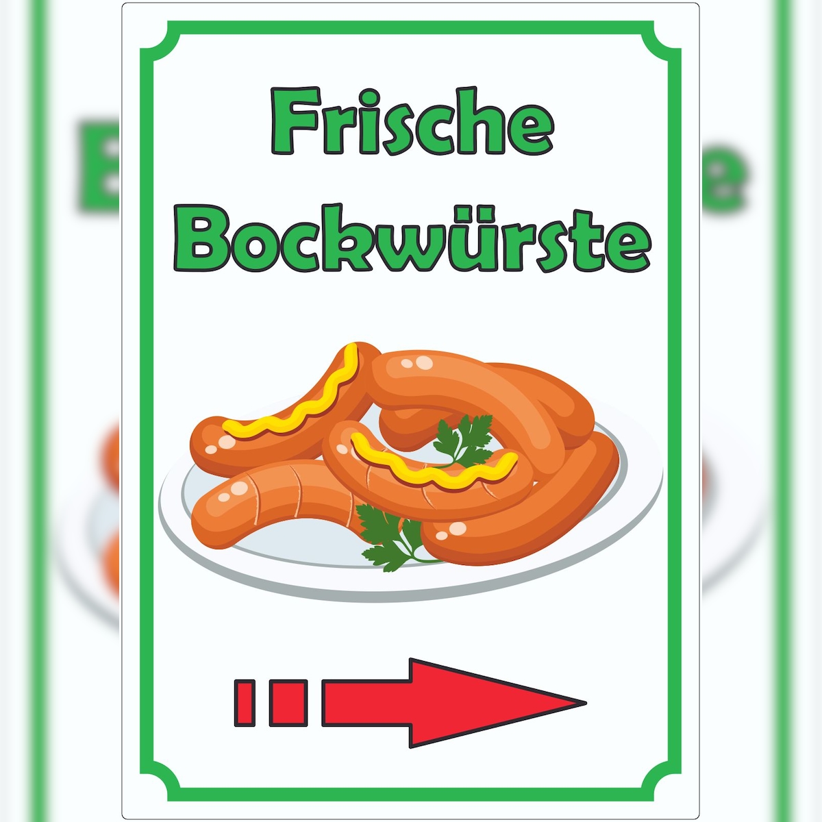 HB-Druck Frische Bockwürste Werbeaufkleber Aufkleber hochkant mit Pfeil nach rechts A4 (210x297mm)