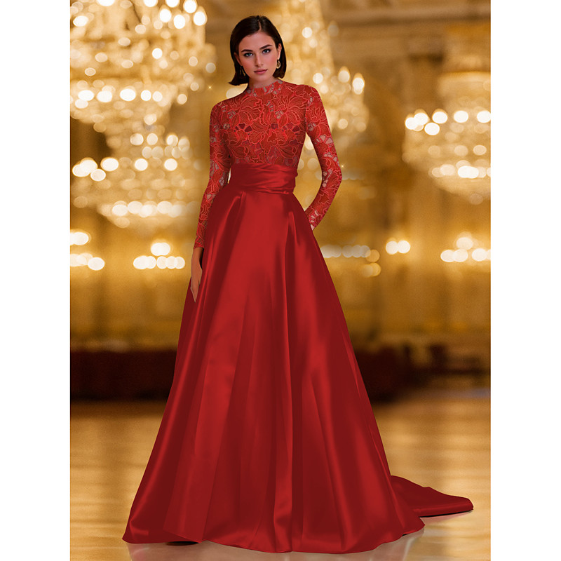 A-Line Sweep Brush Train Evening Gown Ball Gown Formal Dress Elegant Glittering Silky Long Sleeve High Neck Wedding Formal Pocket Satin Velvet with Appliques