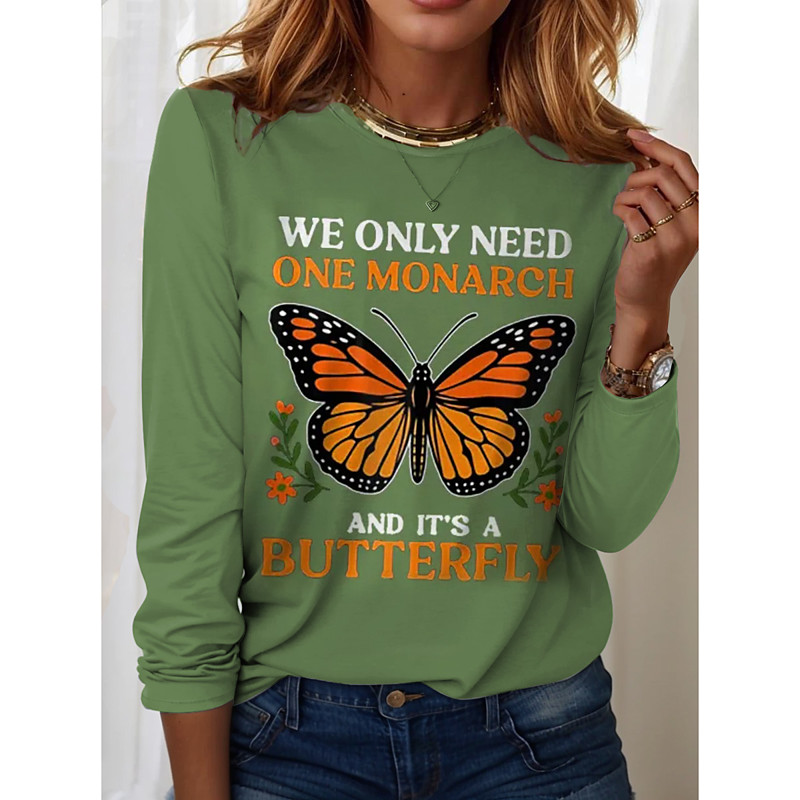 Women's T Shirt Graphic Butterfly Letter Vintage Stylish Classic Long Sleeve Crew Neck Regular Tops Daily Print Black White Blue Orange Green Summer Spring Fall