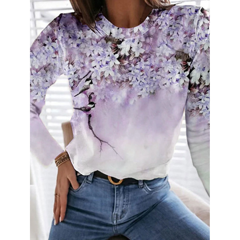 Women's T Shirt Floral Graphic Plants Vintage Fashion Stylish Long Sleeve Crew Neck Round Neck Regular Tops Daily Weekend Print Blue Pink Purple Green Summer Spring Fall