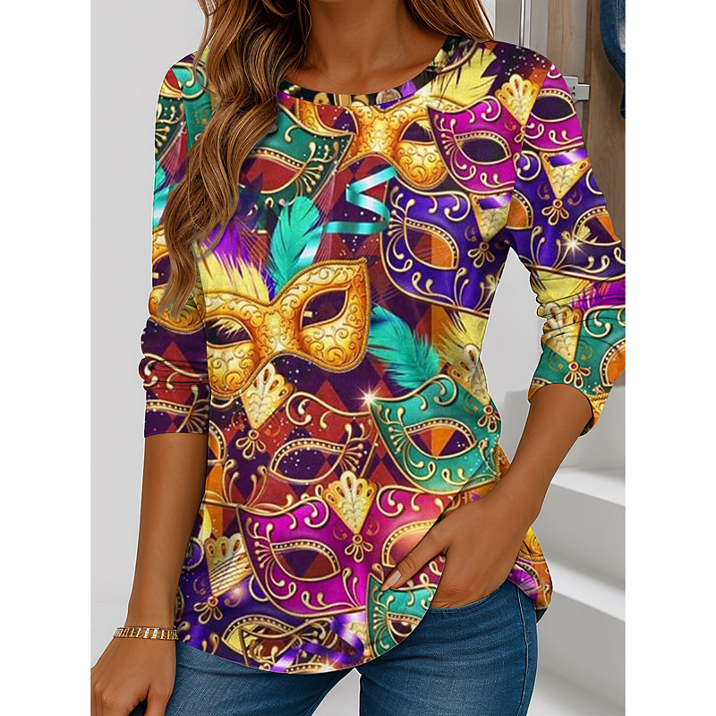 Carnival Women's T Shirt Graphic Geometric Vintage Stylish Classic Long Sleeve Crew Neck Regular Tops Daily Weekend Print Yellow Dark Green Purple Spring Fall