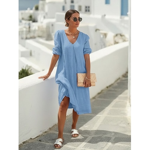 Per donna Abito Midi Finto cotone e lino Vestito Casual Abito in cotone e lino Moda Moderno All'aperto Vacanza Ferie Vestibilità comoda Semplice Mezza Manica Scollo a V Blu Bianco Rosa Azzurro Estate