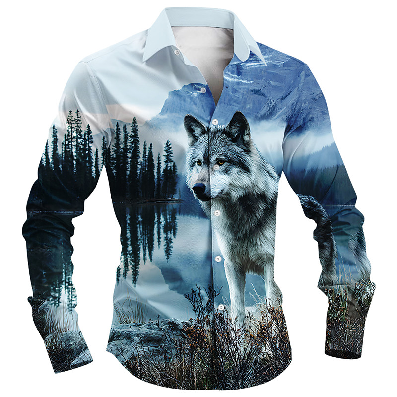 Men's Animal Wolf Forest Shirt Button Up Shirt Long Sleeve Vintage Retro Outdoor Casual Hunting Spring Fall Turndown 3D Print Collared Shirts Green Light Blue