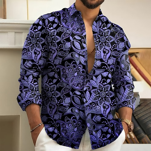 Herren Paisley-Muster Blumendruck Ethnisch Hemd Knopfhemd Langarm Vintage-Retro Ferien Alltagstauglich Frühling Herbst Umlegekragen 3D-Druck Hemden mit Kragen Blau Purpur Gold