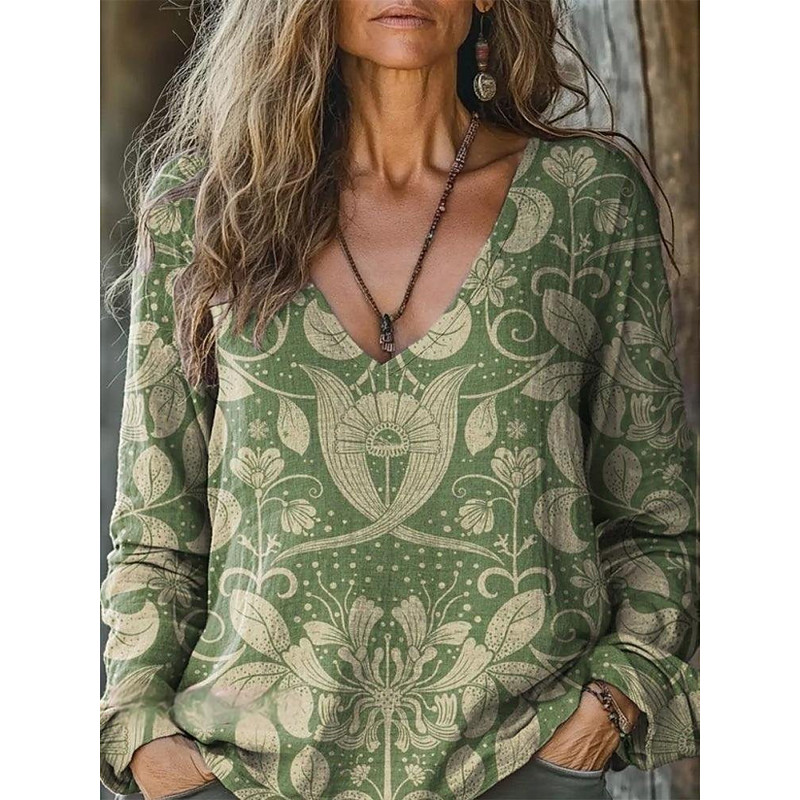 Women's Blouse Floral Bohemia Vintage Long Sleeve V Neck Regular Tops Daily Holiday Print Grass Green Light Green Wine Army Green Red Summer Spring Fall