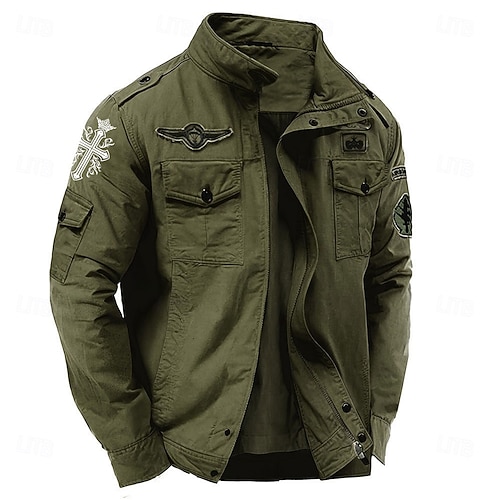 Herren Kreuz Cargo-Jacke Windbreaker Militärjacke Praktisch Lässig Outdoor Campen und Wandern Bestickt Seitentaschen Frontreißverschluss Herbst Winter Stehkragen Langarm Schwarz Kaki Armeegrün