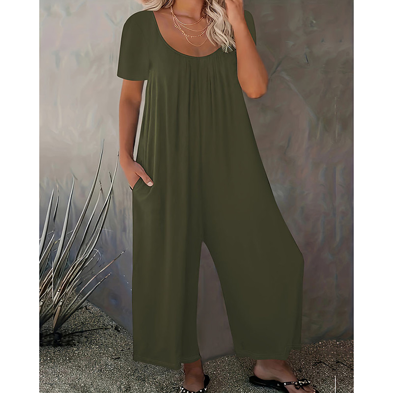 Women's Jumpsuit Active Solid Color Short Sleeve Wide Leg Crew Neck Pocket Daily Vacation Loose Fit Black Wine Red Summer