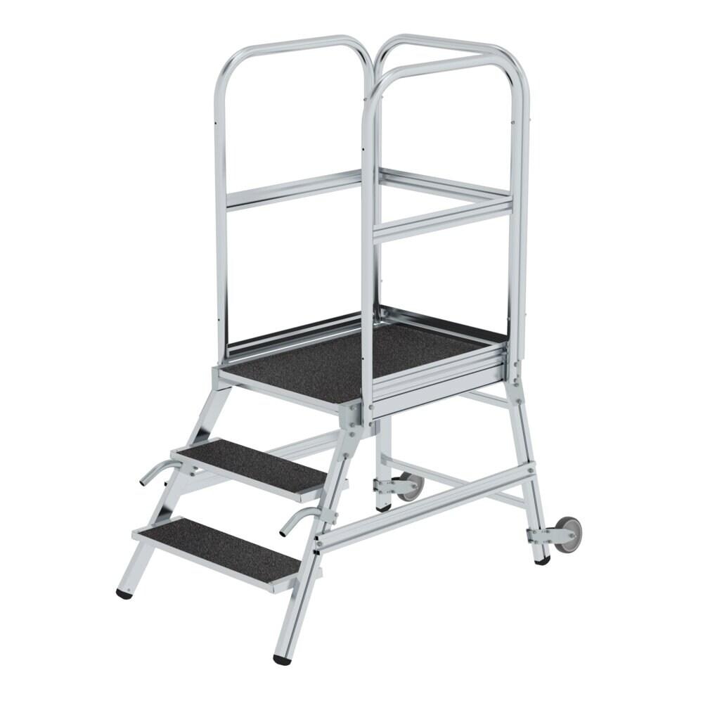 PROREGAL Podesttreppe einseitig begehbar mit Rollen & Griffen | Korundbeschichtung R13 | 3 Stufen | Rutschsichere Leiterschuhe