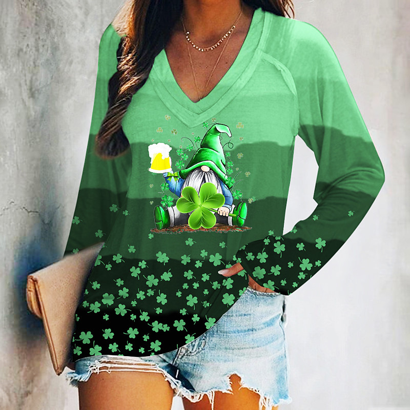 Women's T shirt Tee Heart St. Patrick's Day Grass Green Light Green Army Green Print Long Sleeve Holiday Weekend Basic Neon Bright V Neck Regular Fit Fall Winter