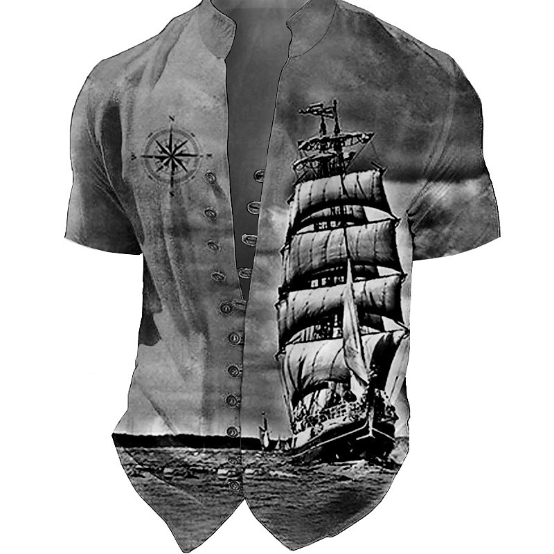 Men's Nautical Vintage Sailboat Shirt Button Up Shirt Short Sleeve Fashion Streetwear Designer Outdoor Vacation Daily Summer Spring Stand Collar Print Blue-Green Black Blue Green Khaki