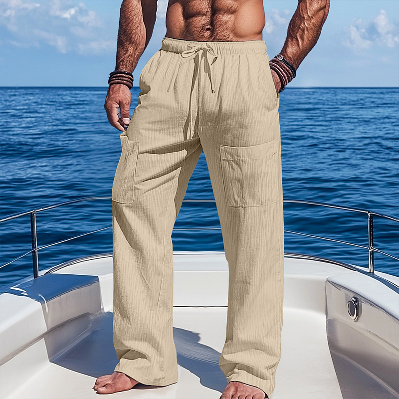 Men's Linen Pants Trousers Summer Pants Baggy Pants Beach Pants Drawstring Elastic Waist Straight Leg Plain Comfort Breathable Full Length Casual Daily Holiday Vacation Fashion Black Apricot