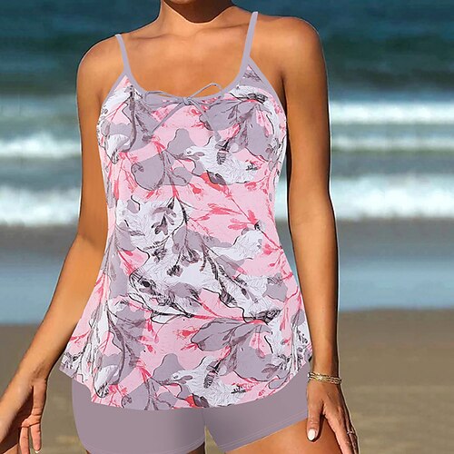 Costume da Bagno Due Pezzi da Donna Tankini Pantaloni Palma Controllo Pancia Alta Vita Slim Senza Schienale Vacanza Spiaggia Fiori Colore Blocco U Collo Senza Maniche