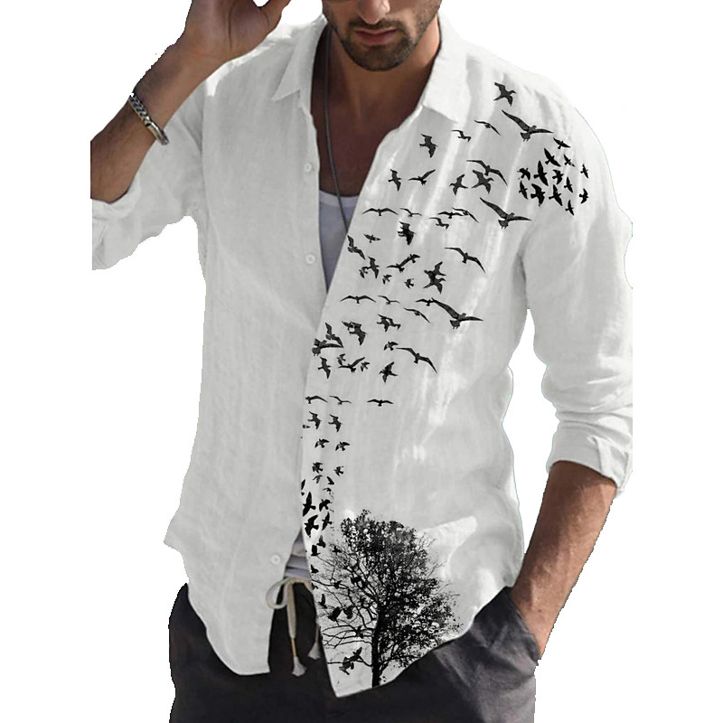Men's Tree Bird Shirt Button Up Shirt Long Sleeve Fashion Designer Casual Outdoor Casual Daily Spring Fall Turndown Print Button-Down White