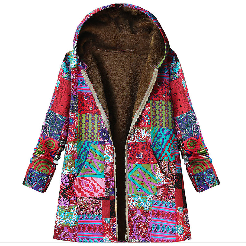 Women's Sherpa Jacket Teddy Coat Hoodie Jacket Comfortable Breathable Pocket Print Vintage Colorful Casual Patchwork Vacation Street Casual Daily Wear Zipper Long Hooded Regular Fit Long Sleeve