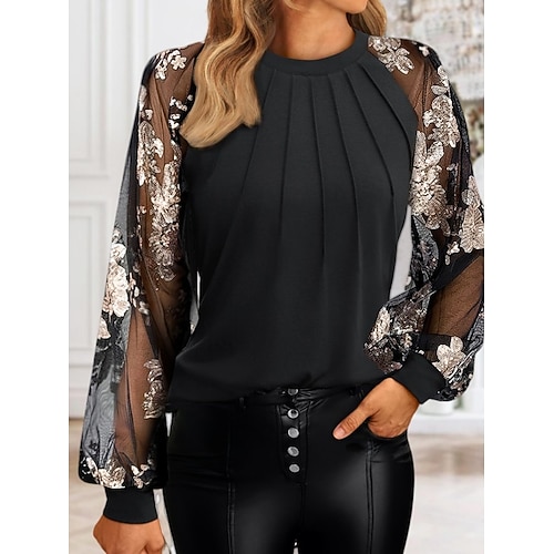 Per donna Blusa Top con paillettes Semplice Vintage Elegante Manica Lunga Girocollo Top Regolari Quotidiano Ferie Uscire Paillettes Patchwork Rete Nero Vino Blu marino Fucsia Grigio chiaro Estate