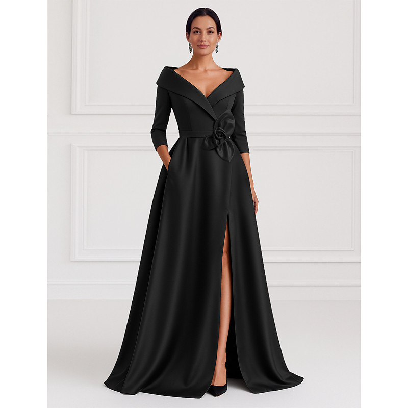 A-Line Floor Length Evening Gown Ball Gown Formal Dress Elegant Silky 3/4 Length Sleeve Shirt Collar Wedding Formal Pocket Stretch Satin with Shouder Flower