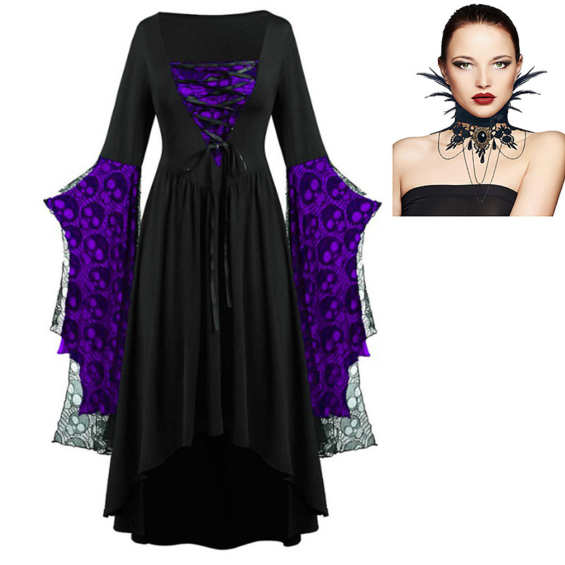 Set with Bat Dress Feather Collar Lace Necklace 2 PCS Outfits Retro Vintage Punk Gothic Steampunk Medieval Dress Maleficent Witches Women's Cosplay Costume Halloween Party Club